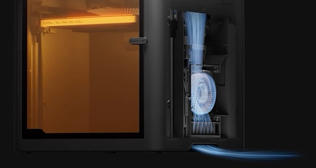 P1Sでは、造形物に風が当たってしまう位置に排気口があったため、この仕組みは使えませんでした。ところがP2Sでは、専用の排気口が作られているため、造形物に風が当たらないようになっています。