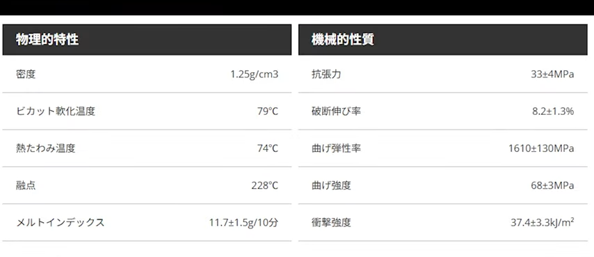 次に、PETG半透明は「79℃」の軟化温度になっています。PLAは61℃なので、より高い耐熱性があります。また衝撃強度も、高い数値となっています。