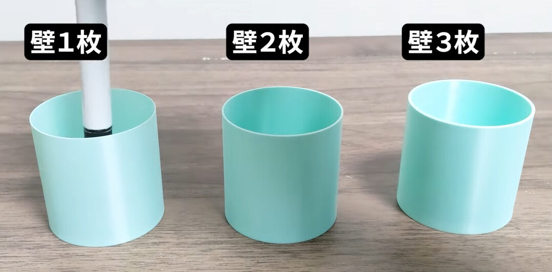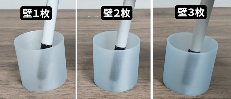 ただ、壁2枚、3枚でも中の状況は分かるので、そこまで大きな差はありませんでした。ちなみにパラメーターはPLA Translucentの初期値のまま行っています。