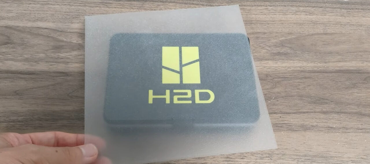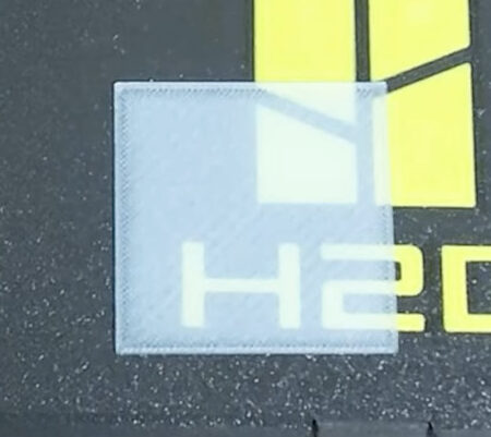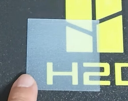 続いて、広い面積のモデルを1層分プリントしたものです。厚さは0.2mmとなっています。一般的なPLAフィラメントでプリントするとこんな感じ↓です。うっすら透けているという程度です。