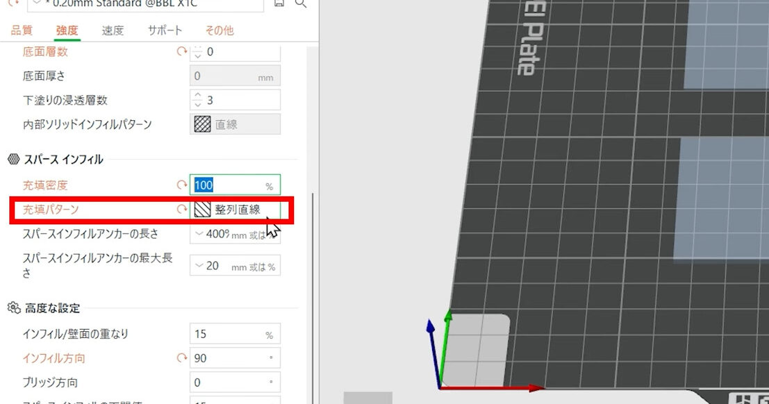 「重点パターン」(Sparse infill pattern)は、整列直線(Grid)を選択します。