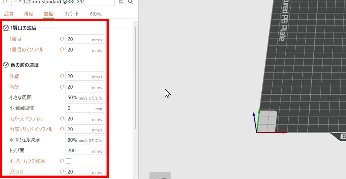 「1層目」(initial layer)や「他の層」(initial layer infill)などを20mm/sに変更します。低速の方が高い透明性が期待できます。